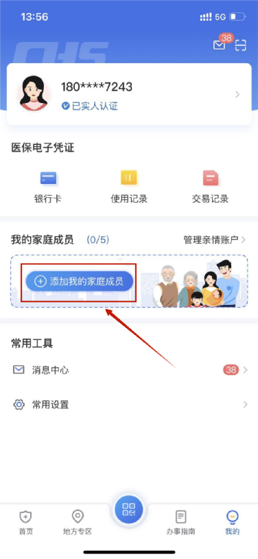 第二步:下载安装“国家医保服务平台”APP,打开后点击底部菜单栏【我的】进入个人中心页面,在【我的家庭成员】