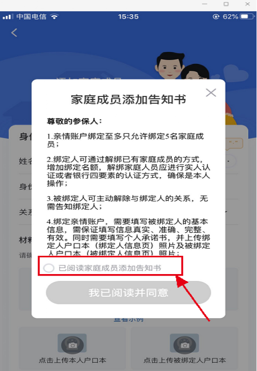 第四步:请仔细阅读《家庭成员添加告知书》,确认无误后点击【我已阅读并同意】按钮进入家庭成员信息填写页面。