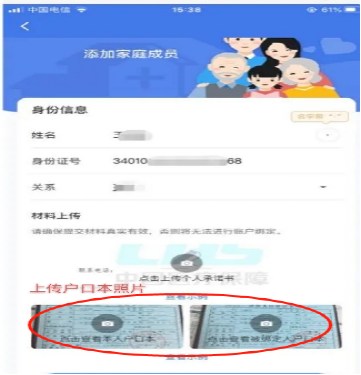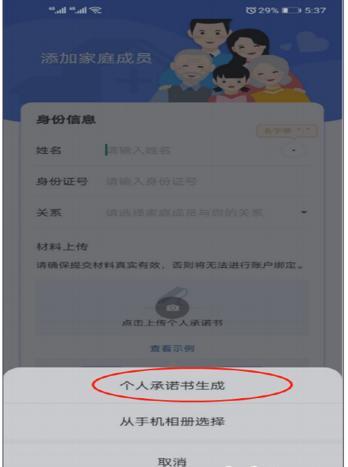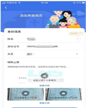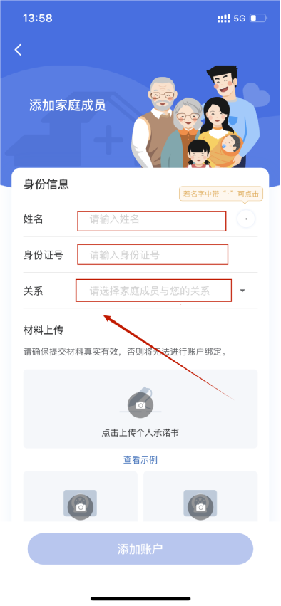 第五步:请在此页面准确填写家庭成员的姓名、身份证号,选择家庭成员与您的关系。确认上述信息准确无误后,点击相机图标并按照示例上传个人承诺书、本人户口本及被绑定人户口本。