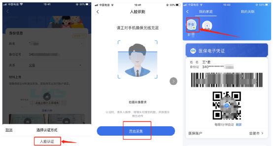 第八步:如果您添加的家庭成员小于16周岁,直接点击【添加账户】按钮即可完成账户关联。如果您添加的家庭成员大于16周岁,点击【添加账户】按钮,通过“人脸认证”后即可完成账户关联。点击该家庭成员图标即可展码使用。