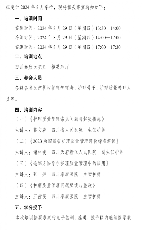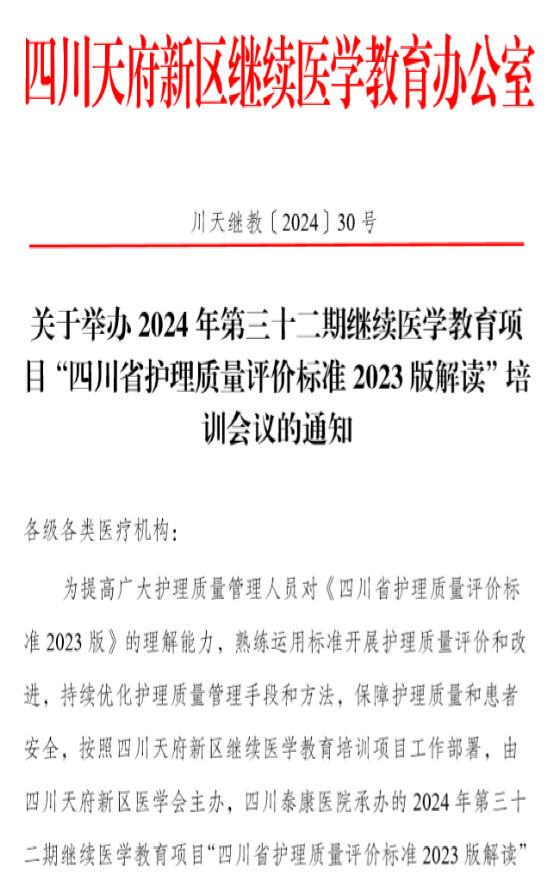 四川泰康医院举办《四川省护理质量评价标准2023版解读”培训》继教项目通知