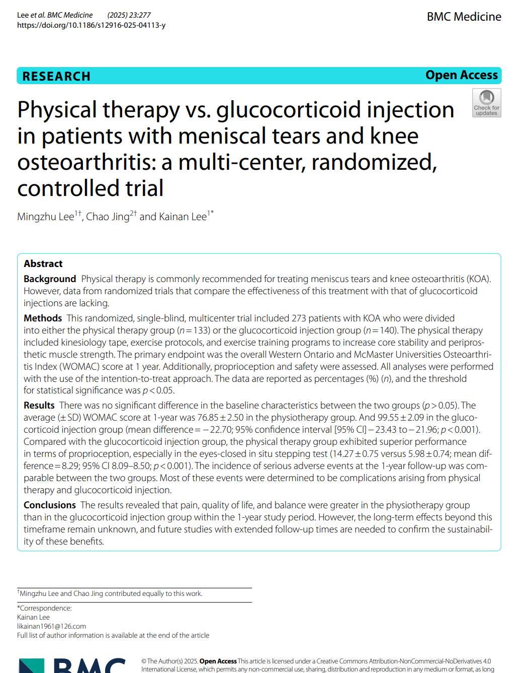 近日,四川泰康医院骨科团队在国际权威期刊《BMC Medicine》(中科院JCR Q1区,IF=7.1)发表题为《Physical therapy vs. glucocorticoid injection in patients with meniscal tears and knee osteoarthritis: a multi-center, randomized, controlled trial》的原创性研究论文。李明珠医师为第一作者,李开南主任担任通讯作者,研究通过随机对照试验为膝骨关节炎(KOA)非药物干预的循证医学提供依据。