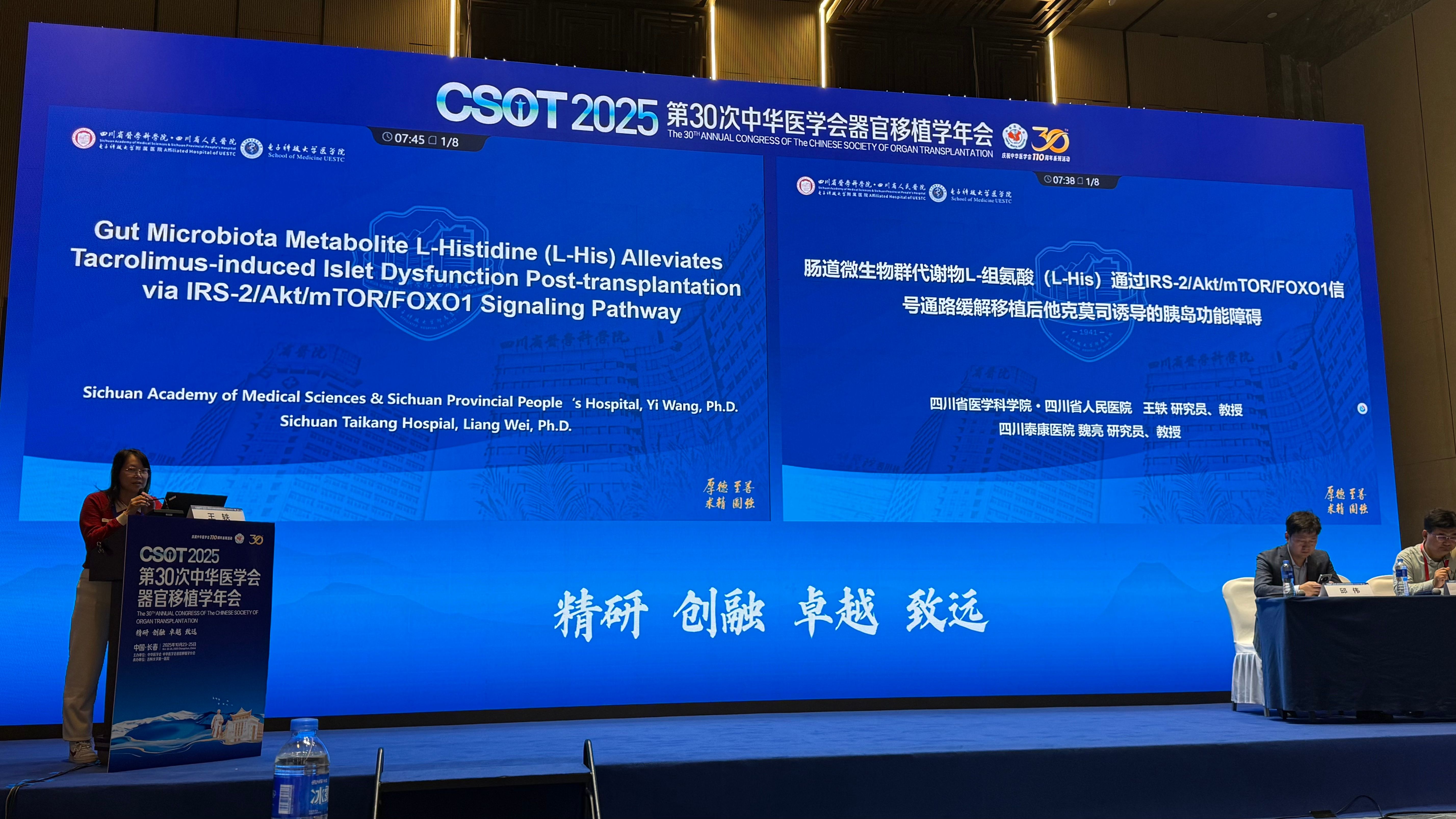 我院魏亮教授与四川省人民医院王轶教授合作的科研论文“Gut Microbiota Metabolite L-Histidine (L-His) Alleviates Tacrolimus-induced Islet Dysfunction Post-transplantation via IRS-2/Akt/mTOR/FOXO1 Signaling Pathway”经大会评审,被录用为国际会场口头发言(Oral Presentation)。该研究基于临床样本与动物实验,系统阐释了L-组氨酸对他克莫司所致移植后胰岛功能紊乱的调节机制,并揭示了其经由IRS-2/Akt/mTOR/FOXO1信号通路发挥保护作用,为防治移植后新发糖尿病及优化血糖管理策略提供了新思路和潜在干预靶点。