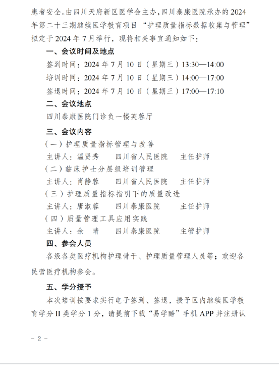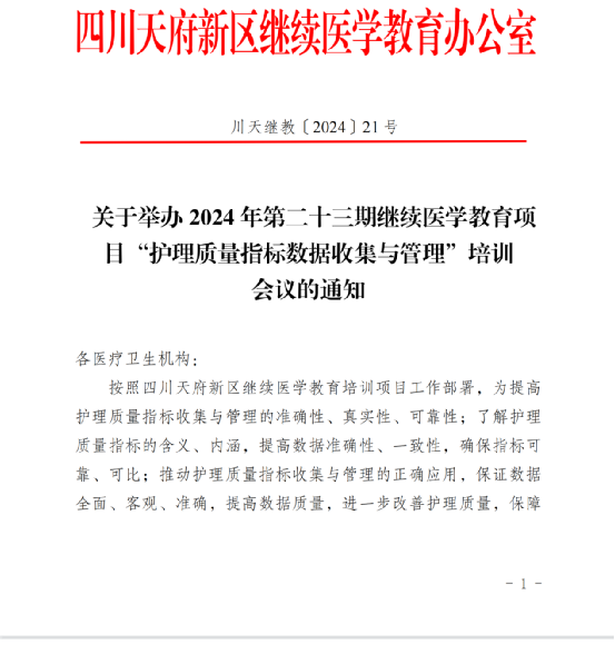 为提高护理质量指标收集与管理的准确性、真实性、可靠性;了解护理质量指标的含义、内涵,提高数据准确性、一致性,确保指标可靠、可比;推动护理质量指标收集与管理的正确应用,保证数据全面、客观、准确,提高数据质量,进一步改善护理质量,保障患者安全。四川泰康医院定于 2024 年7月10日举办2024年天府新区医学会第二十三期继续医学教育项目“护理质量指标数据收集与管理”培训,敬请广大医护人员参会!