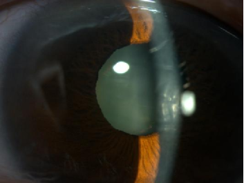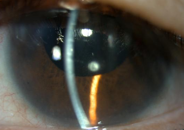 左眼术前眼压恢复正常时前节照相:角膜轻度水肿、后弹力层皱褶、前房深度极浅、周边虹膜膨隆